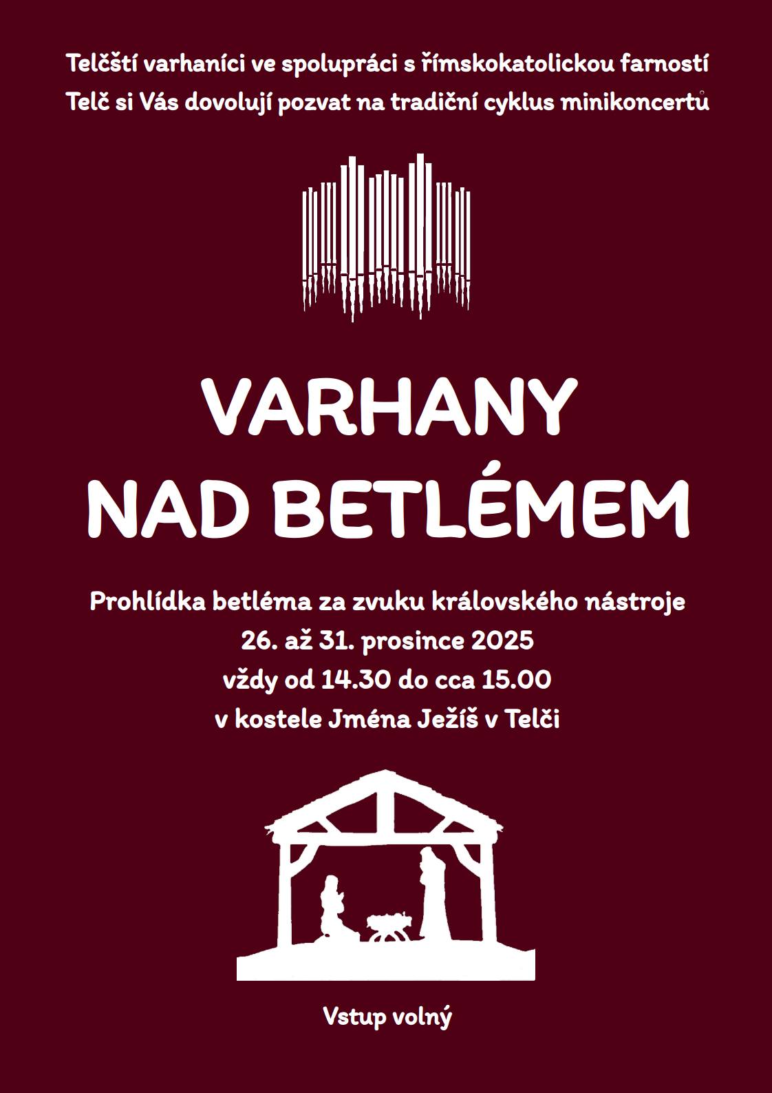 Telčští varhaníci ve spolupráci s římskokatolickou farností Telč si Vás dovolují pozvat na tradiční cyklus minikoncertů s názvem „Varhany nad betlémem“. Každý den od 26. do 31. prosince jste zváni na prohlídku betléma v kostele Jména Ježíš za zvuku varhan a dalších nástrojů. Vždy mezi 14.30 a 15.00. Vstup volný.